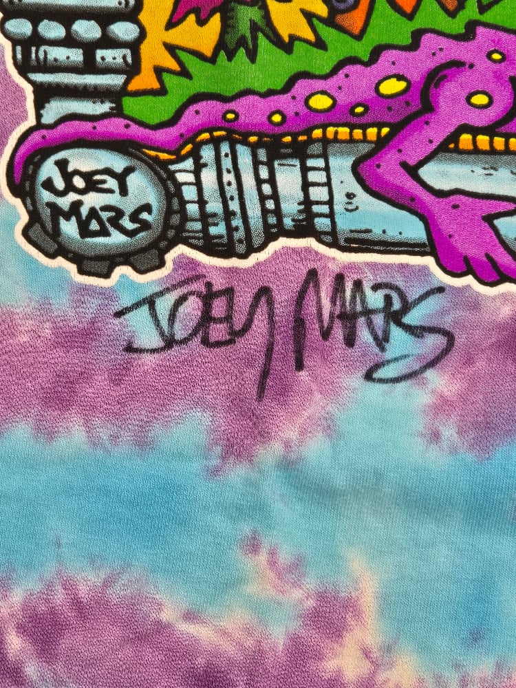 Frolicking Characters in a surreal garden. Released September 2025 Produced by Liquid Blue. Shirt comes hand signed by Joey Mars with 1/1 Certificate of Authentication with an Original Drawing.