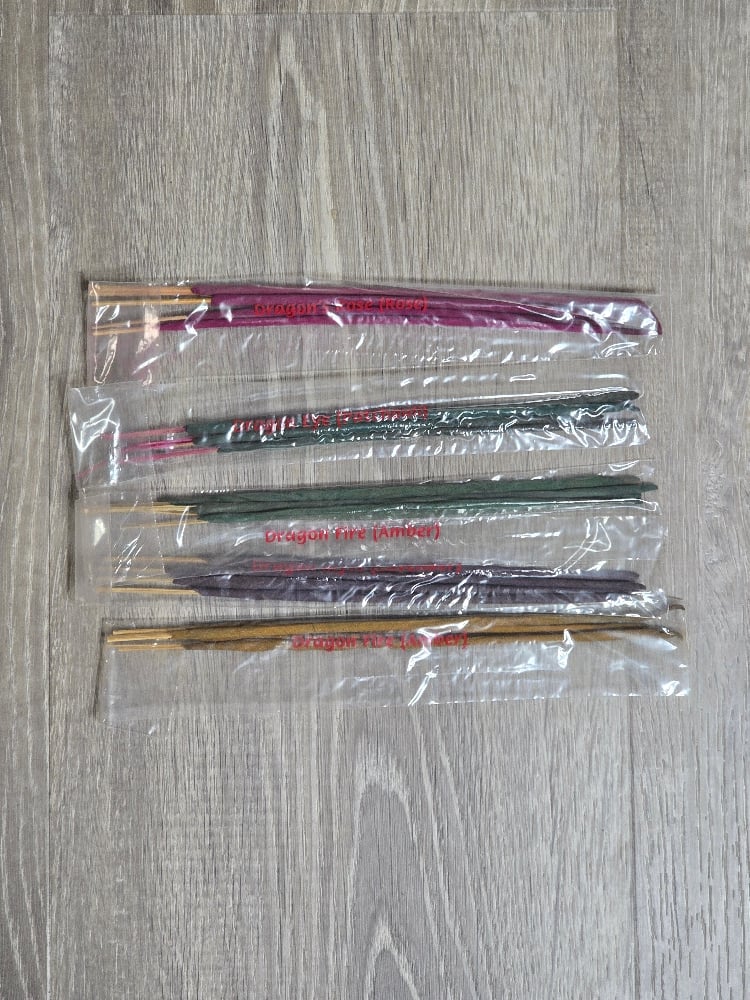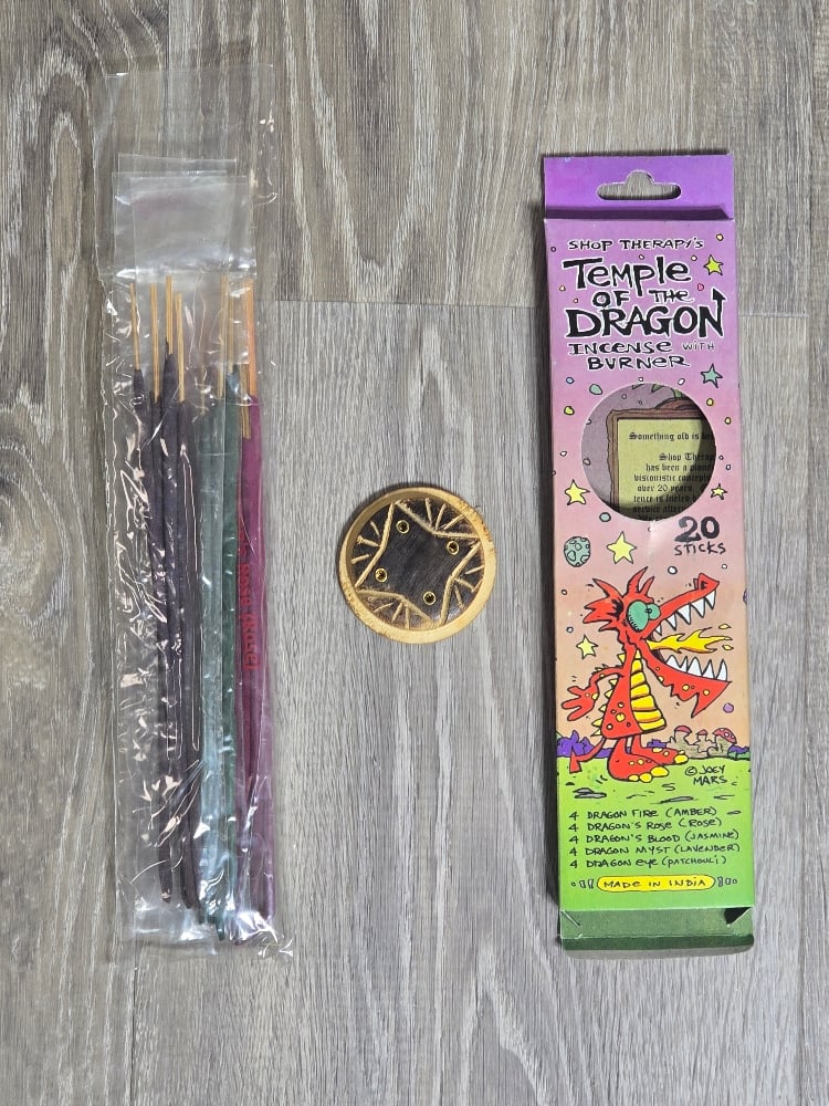 Shop Therapy's Temple of the Dragon with Incense Burner. 20 hand rolled sticks with a wood burner. Package Measures 2.5x9 Inches. Sticks Measure 8.25 Inches. Wood Burner is 2 Inch Diameter. We have included 5 of Indias best known traditional scents. Amber, Rose, Jasmine, Lavender and Patchouli. May your Dragon be with you 🐲 . Joey Mars with the wrap around box Art 🎨 ✨️