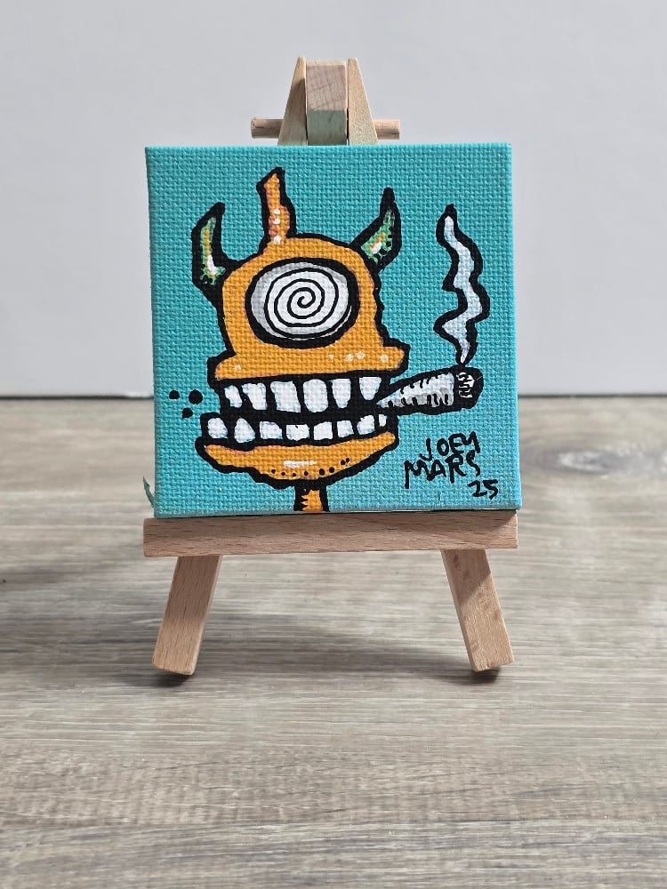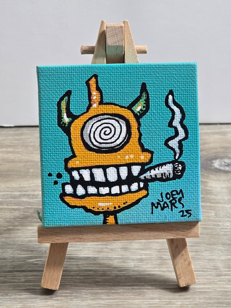 Original Art painted on canvas 2.5x2.5 Inches. Signed and dated. Comes with easel.