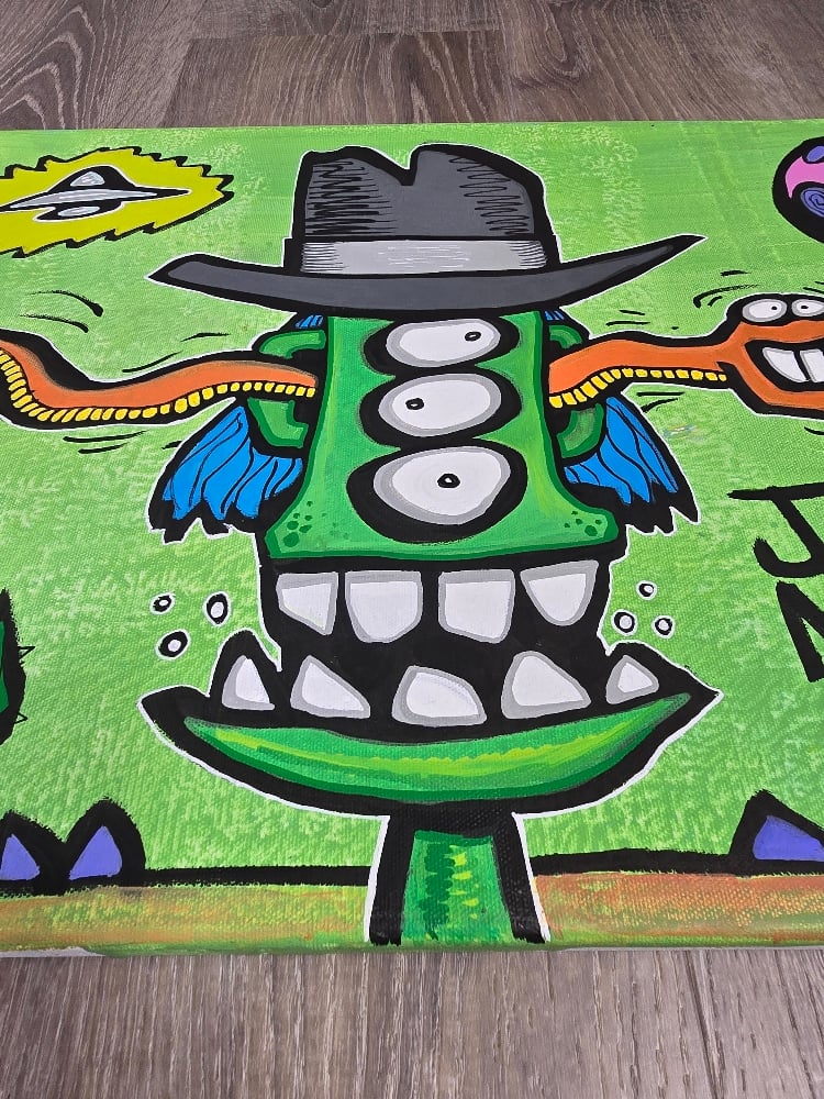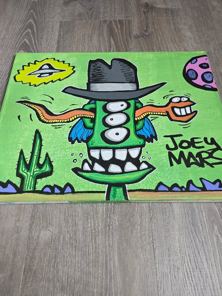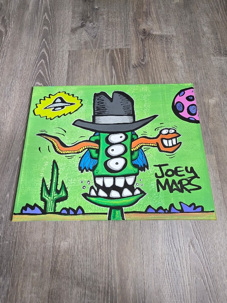 1/1 Original 16x20 on canvas Joey Mars Painting. Acrylics on Canvas. The UFO hovers above the green desert sky. Have you been snakeflushed?...🤔 Free shipping within the continental U.S.
